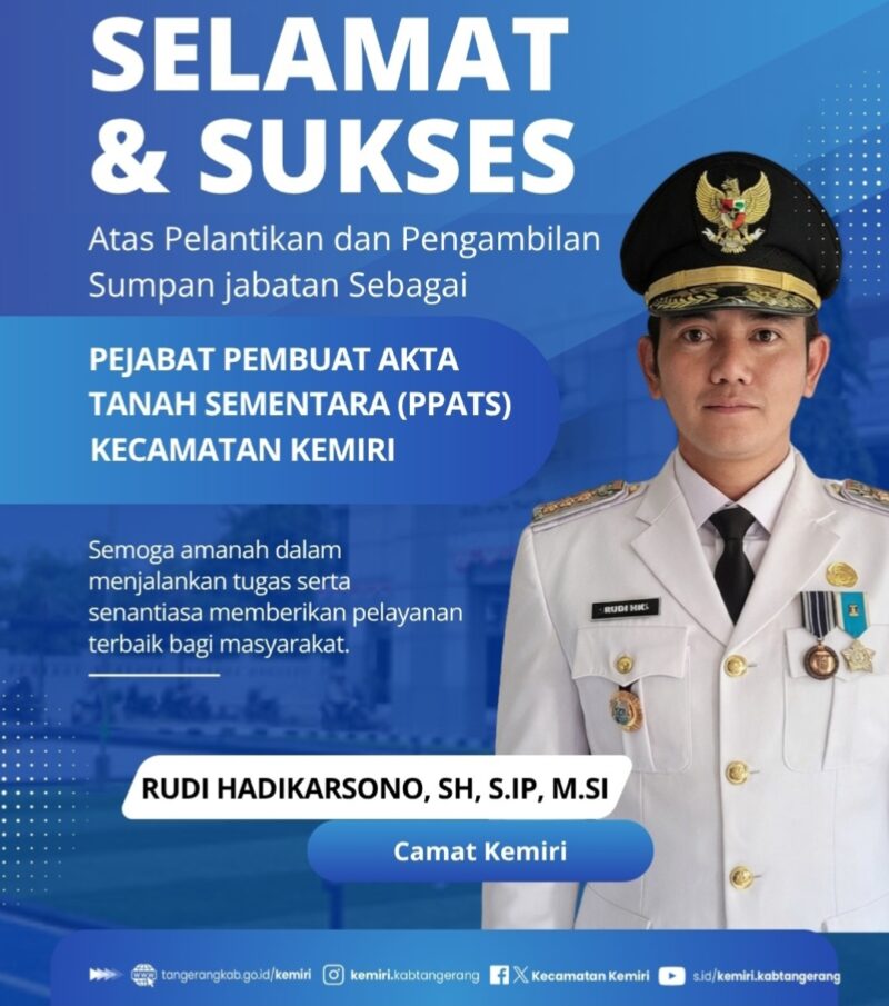 LENSABUMI.COM– Dalam upaya meningkatkan kualitas pelayanan publik, khususnya di sektor pertanahan, Camat Kemiri, Rudi Hadikarsono, S.H., S.IP., M.Si., secara resmi telah dilantik dan diambil sumpahnya sebagai Pejabat Pembuat Akta Tanah (PPAT) Sementara untuk wilayah kerja Kecamatan Kemiri.