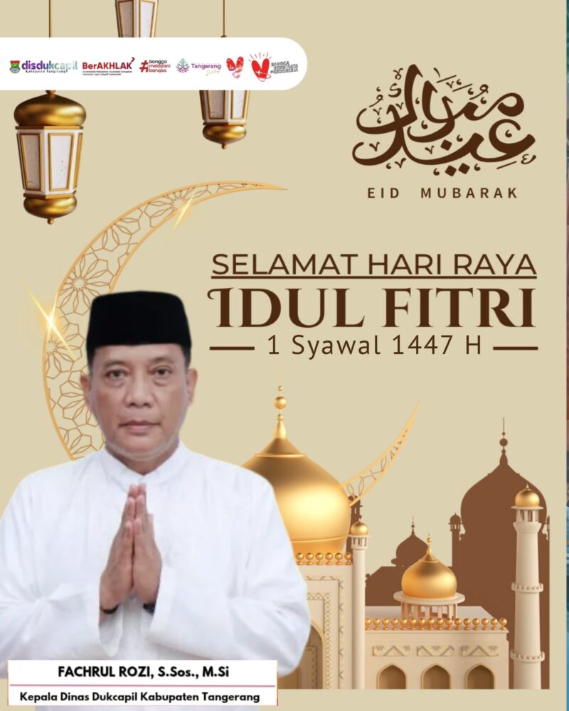 TANGERANG – Dalam rangka menyambut hari kemenangan umat Islam, Kepala Dinas Kependudukan dan Pencatatan Sipil (Disdukcapil) Kabupaten Tangerang, Fachrul Rozi, S.Sos., M.Si., menyampaikan ucapan selamat Hari Raya Idulfitri 1447 Hijriah kepada seluruh masyarakat Kabupaten Tangerang.