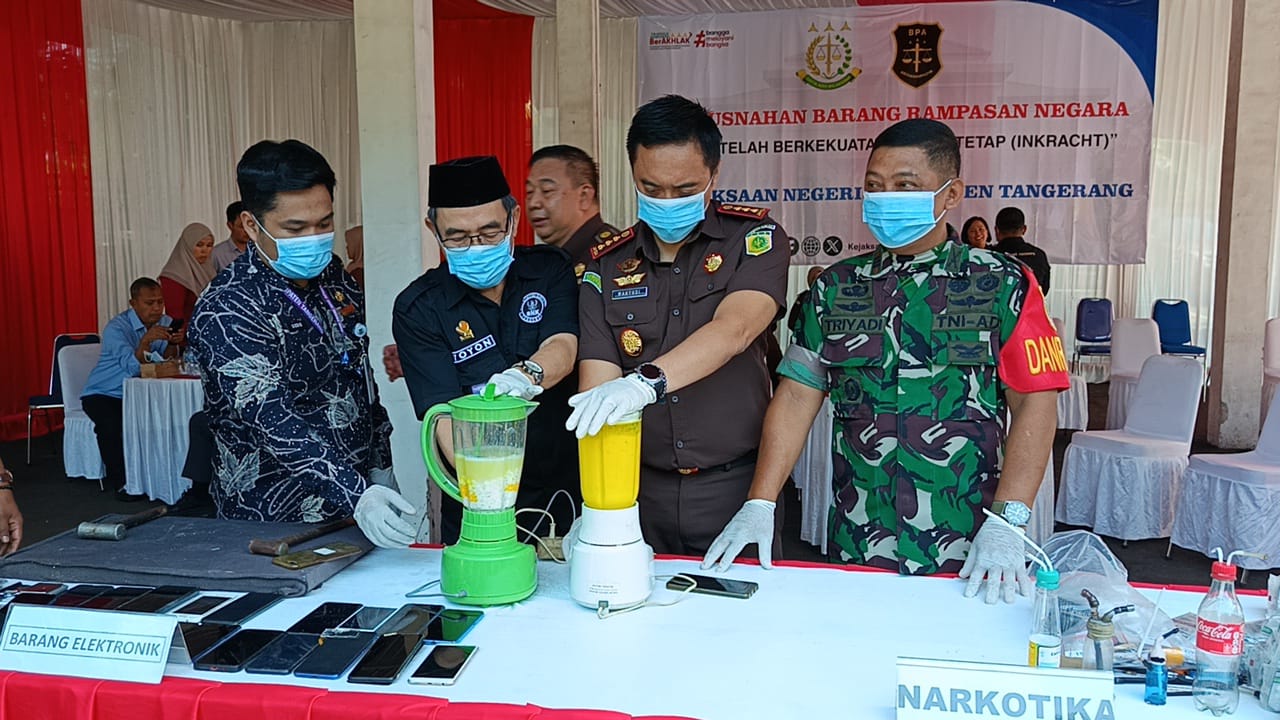 “Pemusnahan dilakukan terhadap barang bukti dari 63 perkara pidana umum dan pidana khusus yang telah berkekuatan hukum tetap atau inkrah,” kata Kepala Kejari Kabupaten Tangerang Wahyudi Eko Husodo.