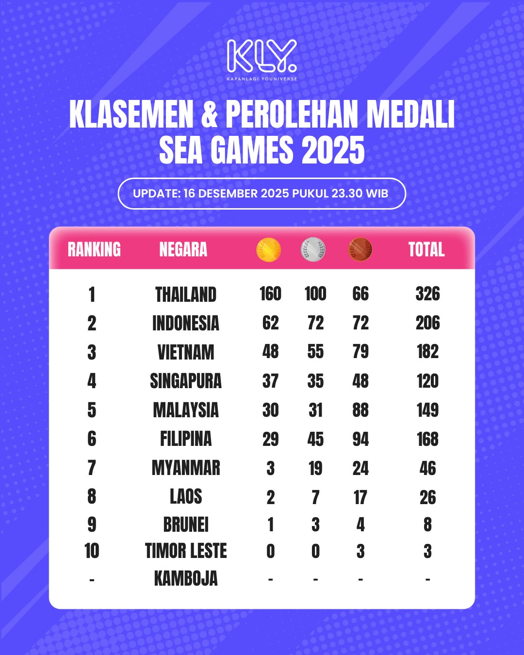lensabumi.com – Kontingen Indonesia menambah 10 medali untuk memperkuat posisi kedua klasemen sementara SEA Games Thailand 2025 dengan total mengumpulkan 62 emas, 72 perak, dan 72 perunggu.