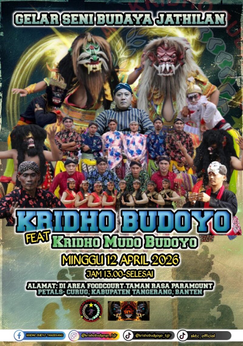 Tangerang, Lensabumi.com – Kelompok Seni Jathilan Kridho Budoyo Tangerang.  Akan menggelar pertunjukan akbar “Gelar Seni Budaya Jathilan Kridho Budoyo Feat Kridho Mudo Budoyo”*.  Pada besok hari Minggu, 12 April 2026, pukul 13.00 WIB sampai selesai*.
