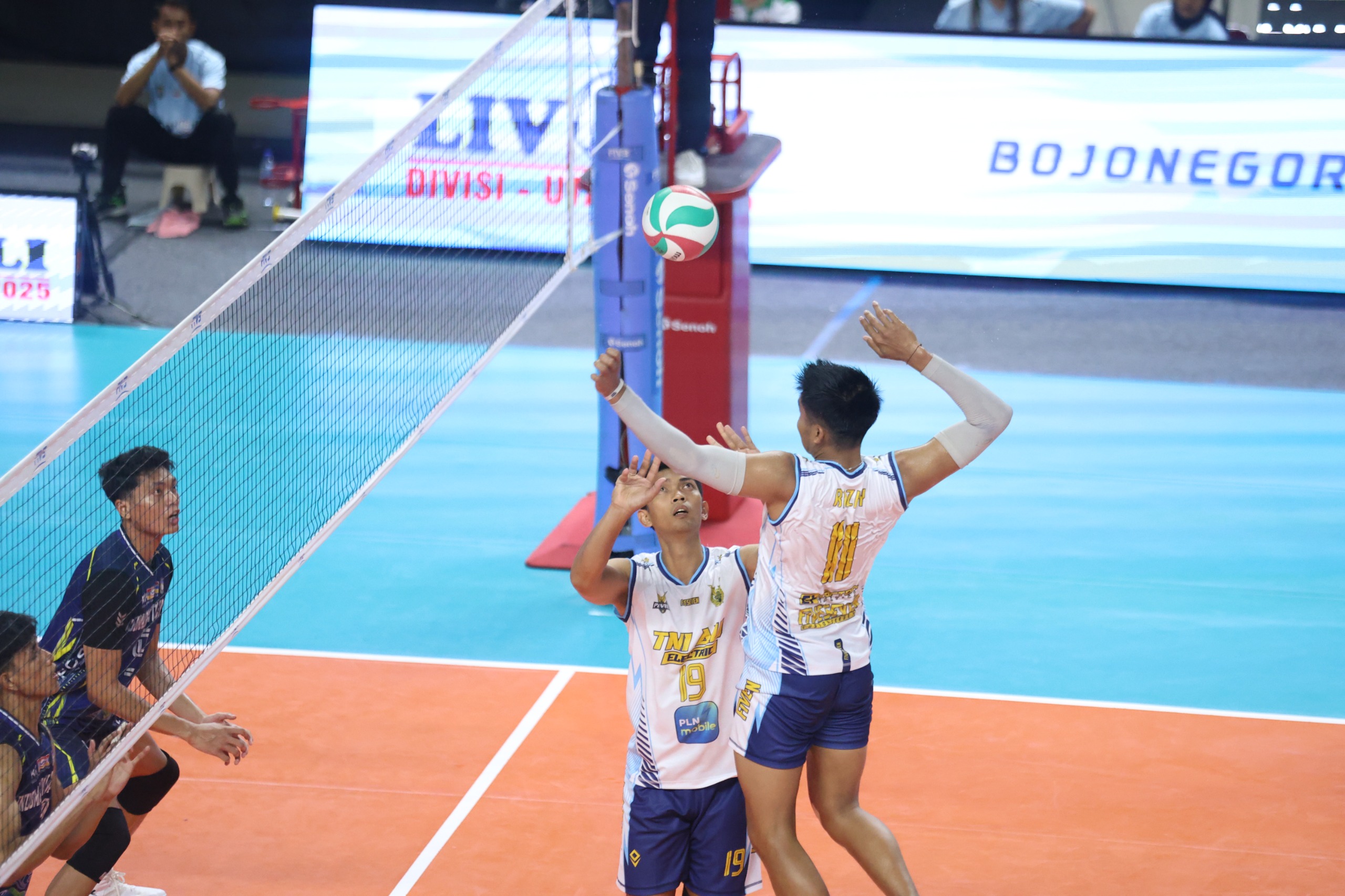 lensabumi.com – Tim putra TNI AU Electric selangkah lagi melaju ke babak final four Livoli Divisi Utama 2025, usai mengalahkan Indomaret 3-0 (25-23, 25-20, 25-23) dalam lanjutan Putaran Reguler Kedua di GOR Utama Bojonegoro, Kamis (25/9/2025) malam.