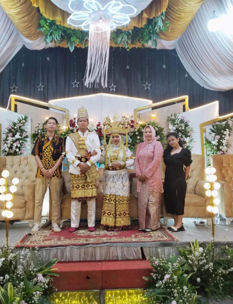 ‎Kedua mempelai tampil memukau dengan busana pengantin Adat Khas Lampung dan Sumatra Barat yang elegan, memancarkan aura layaknya raja dan ratu sehari di atas pelaminan yang didekorasi penuh bunga segar.