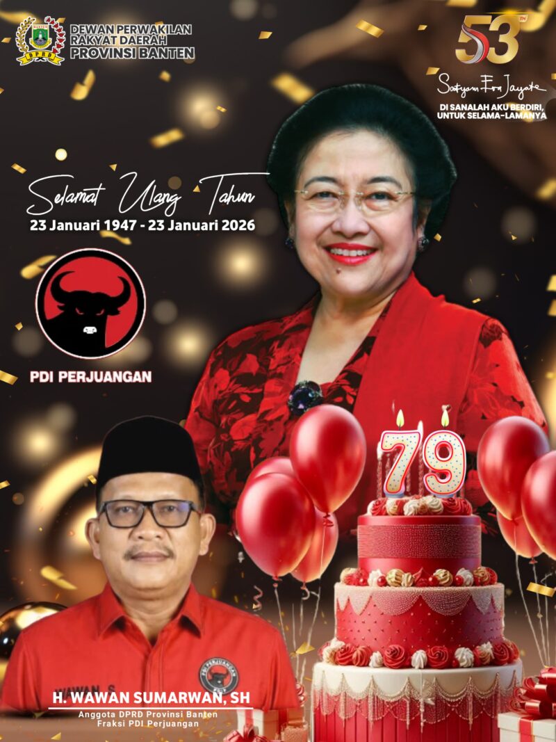 Kabupaten Tangerang – Anggota DPRD Provinsi Banten sekaligus wakil Ketua Bidang Pemenangan Pemilu DPC PDI perjuangan Kabupaten Tangerang, H. Wawan Sumarwan, SH., menyampaikan ucapan Happy Milad kepada Presiden ke-5 Republik Indonesia sekaligus Ketua Umum PDI Perjuangan, Prof. Dr. (H.C.) Hj. Megawati Soekarnoputri, yang genap berusia 79 tahun pada hari ini, Jumat, 23 Januari 2026.
