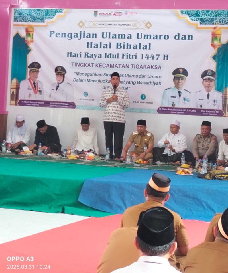 Dalam sambutannya, M. Nur Rojab menyampaikan apresiasi atas konsistensi Pemerintah Kecamatan Tigaraksa dalam menyelenggarakan forum silaturahmi ini. Beliau menekankan bahwa kolaborasi antara tokoh agama dan jajaran pemerintahan adalah kunci utama dalam menjaga kondusivitas serta menyukseskan program pembangunan di tingkat kecamatan maupun kabupaten.