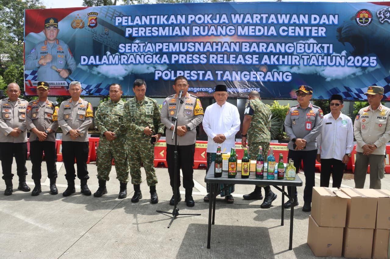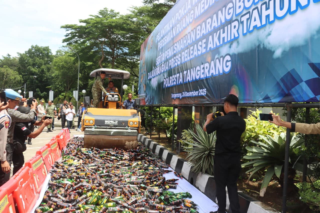 Dalam rangkaian Rilis Akhir Tahun, Polresta Tangerang juga melakukan pemusnahan barang bukti berupa 135 dus berisi 1.860 botol minuman keras, 70 bilah senjata tajam, serta 27 knalpot brong hasil Operasi Patuh.