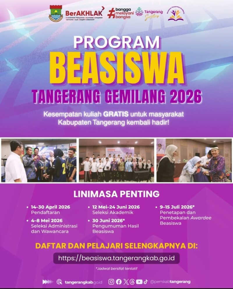 TANGERANG, LENSABUMI.COM– Pemerintah Kabupaten (Pemkab) Tangerang kembali membuka peluang emas bagi putra-putri daerah melalui program Beasiswa Tangerang Gemilang 2026. Program ini merupakan komitmen nyata pemerintah dalam memperluas akses pendidikan tinggi, khususnya bagi mahasiswa berprestasi dan mereka yang memiliki keterbatasan ekonomi.